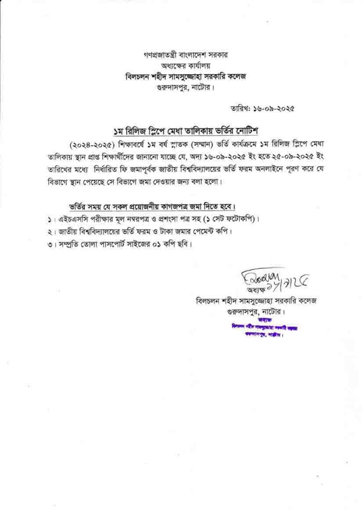 বিজ্ঞপ্তি- অনার্স ১ম বর্ষ রিলিজ সংক্রান্ত