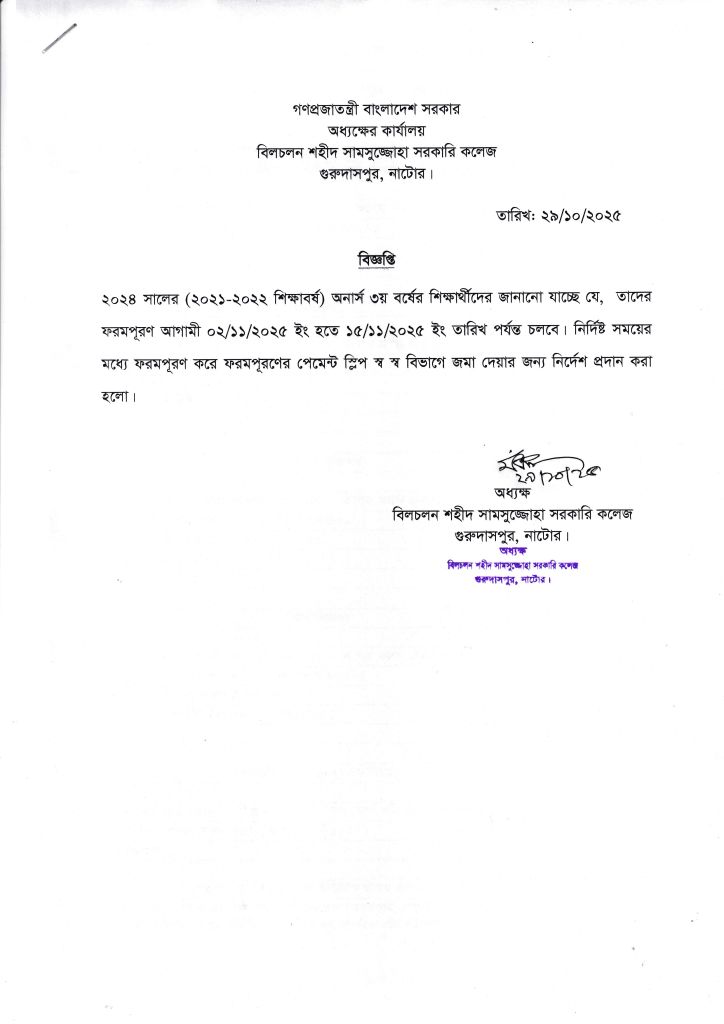 বিজ্ঞপ্তি- অনার্স ৩য় বর্ষ ফরমপূরণ সংক্রান্ত