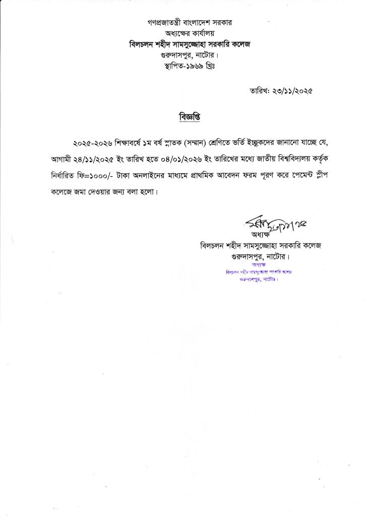 বিজ্ঞপ্তি- অনার্স ১ম বর্ষ ২০২৫-২৬ শিক্ষাবর্ষের প্রাথমিক আবেদন সংক্রান্ত
